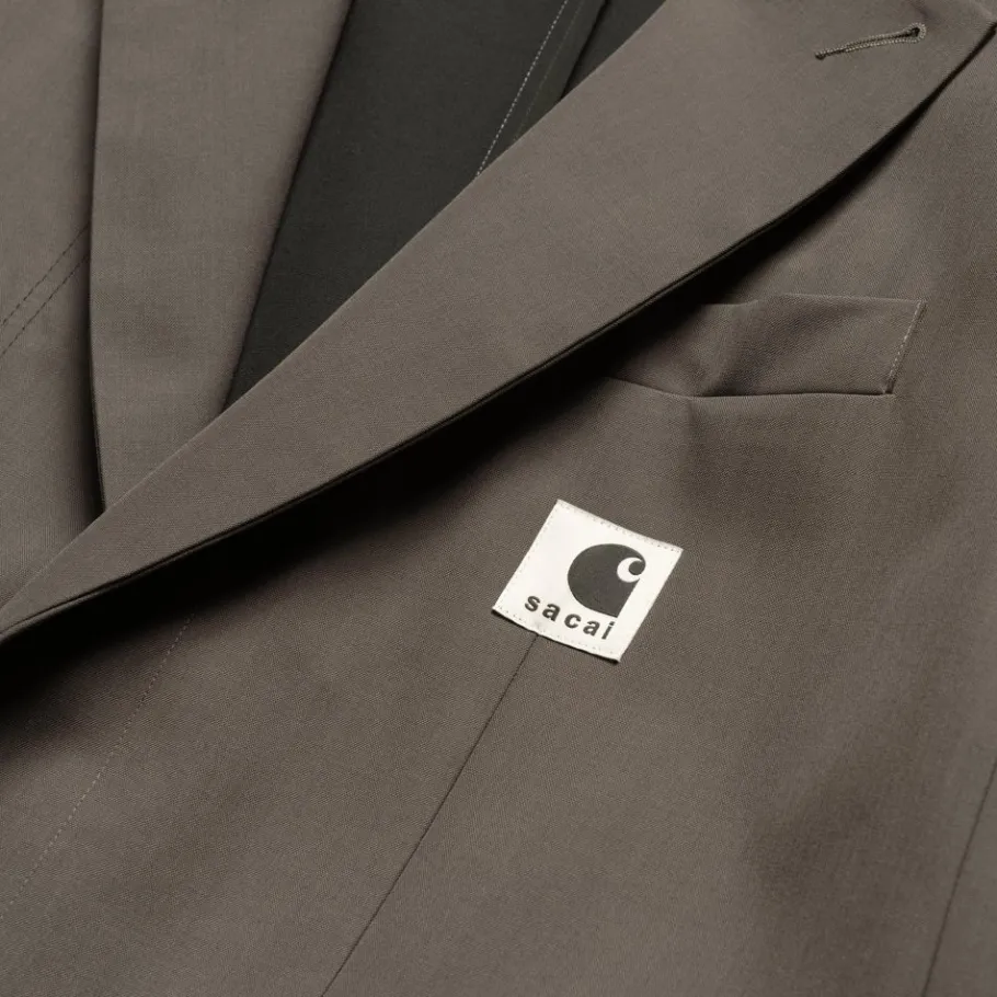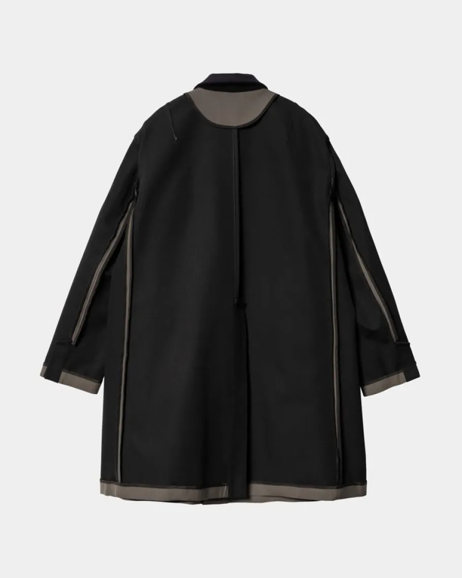 Suiting Bonding Coat Er En Hybrid Af Carhartt Wip’S Siberian Parka Og Sacais Chesterfield Pels. Varen Er Konstrueret Af To Sammenbundne Lag Stof Og Kan Bæres Vrangen Ud. På Overfladen Er Sacai’S Uld-Blend Suiting Stof Og På Bagsiden Er Carhartt Wip’S Duck Canvas. Varen Har Samme Design På Ydersiden Som Sacais Chesterfield Frakke. Indersiden Har I Mellemtiden Påsyede Lommer, Piping Og Syninger, Der Tilhører Carhartt Wip’S Siberian Parka. Denne Syning Trækker Også Igennem På Emnets Overflade. Når Den Bæres Vrangen Ud, Er Varens Rørdetaljer Et Karakteristisk Træk. En Co-Branded Vævet Etiket Vises På Begge Sider.