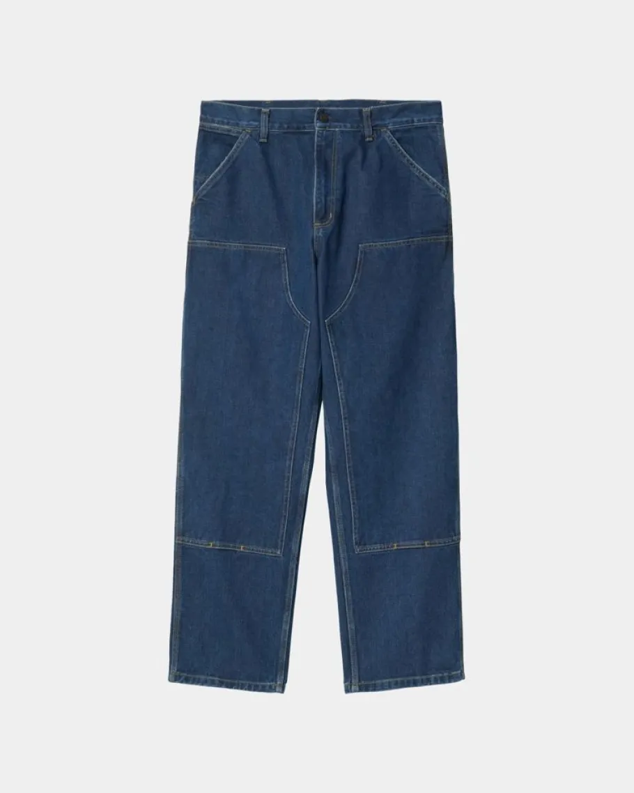 The Double Knee Pant Er Lavet I En Afslappet Lige Pasform Fra Smith Denim, Som Er Et Kraftigt Bomuldsstof. Stylen Fås Både I En Skyllet Version Og En Stenvasket Version, Hvor Sidstnævnte Giver En Blødere Fornemmelse Og Let Slidt Udseende. Dobbeltlagsknæ Giver Ekstra Forstærkning, Mens Trensømning, Nittedetaljer, Værktøjslommer Og En Hammerløkke Nikker Til Stilens Utilitaristiske Påvirkninger. For Et Lignende Design Har Single Knee Pant Det Samme Værktøj Lommer Og Hammerløkke Uden Dobbeltlags Knæ, Mens Simple Pant Har En Lignende Pasform Og Konstruktion, I Et Rent 5-Lommet Design.