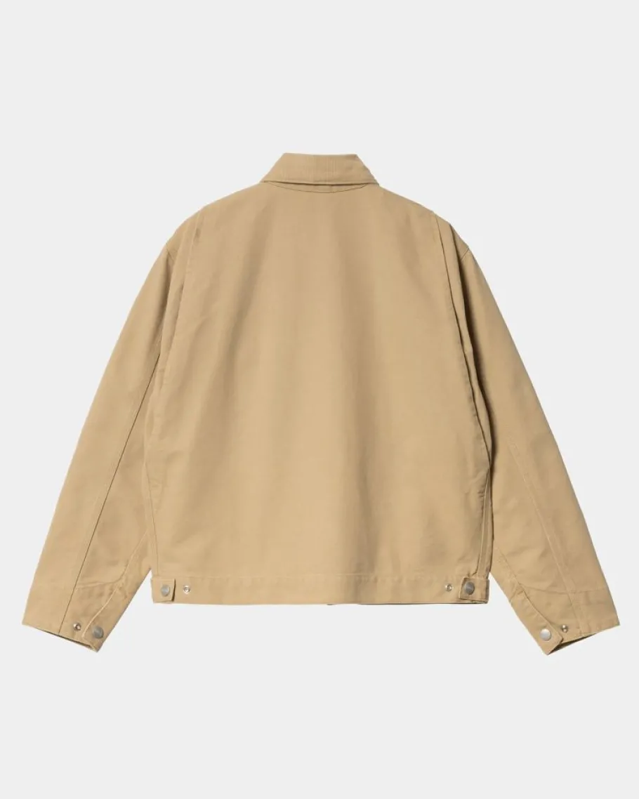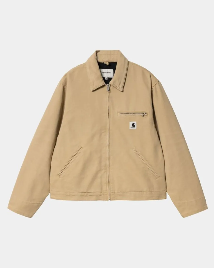 Og Detroit-Jakken Til Kvinder Er Lavet I Vores Originale Løse Pasform Af 12 Oz Økologisk Bomuld Dearborn Canvas, Som Er Et Robust Stof, Der Vil Blive Blødt Med Slid Over Tid. Tøjet Er Foret Med Bomuld I Kroppen Og Nylon I Ærmerne. Den Er Yderligere Detaljeret Med En Justerbar Søm Og Manchetter. En Fløjlskrave, En Brystlomme Og En Guldfarvet Lynlåslukning Giver Taktile Detaljer, Mens Tredobbelte Stingsdetaljer Giver Ekstra Holdbarhed.